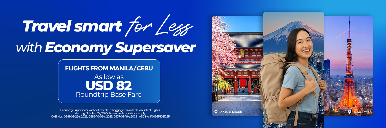 Economy Supersaver is available on select flights from Manila/Cebu to Japan (except Sapporo), Thailand, Indonesia, Cambodia, Australia (except Brisbane and Perth), Hong Kong, Taipei, China, Singapore, Malaysia, Vietnam.